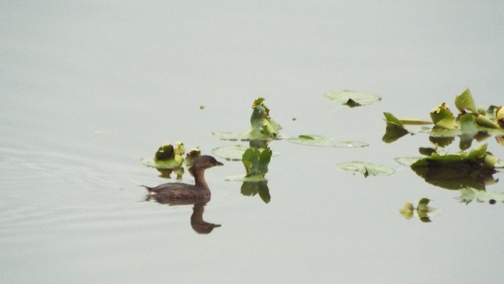 So that’s how I found this little fella. He is pretty tiny. A different shape than the other grebes. The first day I thought he was a grebe, but his neck is different, his bill is different. And his neck is orange. So is the underneath of his body.