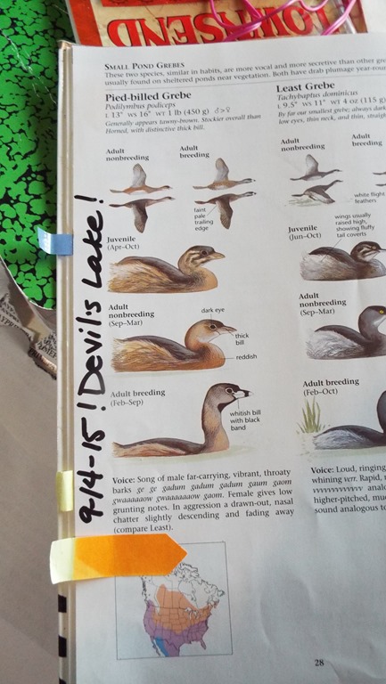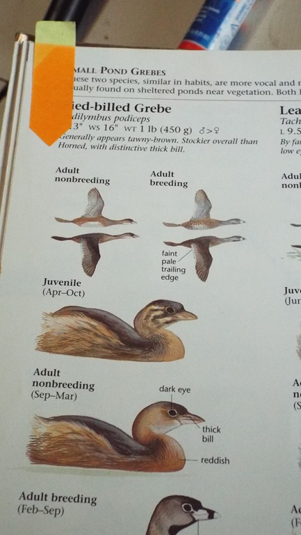 With this information, I looked up grebes and imagine my delight when this lil fella, the Plied Billed Grebe had one of my last remaining tabs! I got to write in a new entry! Thanks to the Handdbook of Nature Study – I spent time with an App and created a Life Bird List. Then my iPod got lost or stolen, and I couldn’t replace it. That’s when I moved my bird list to the Sibley Book.