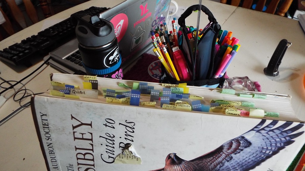 Five years later – this is where we are! Tabs get moved to the side. Not all my birds are tabbed, but they are marked. One year, when I was seriously bored, I counted them. I might do that again this winter, during a week of rain and no surf.