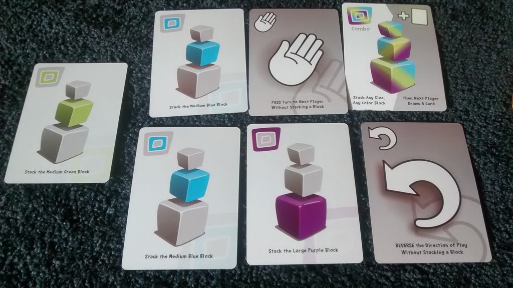 You pick a card from your hand, select that size block (three sizes three colors, three of each color, nine total) . Using one hand, stack the block, without using your block or hand to tug or rearrange those blocks below. if you tower can stand for 3 seconds after you remove your fingers, you’ve made your turn. If not, you pull out 3 cards from the pile.