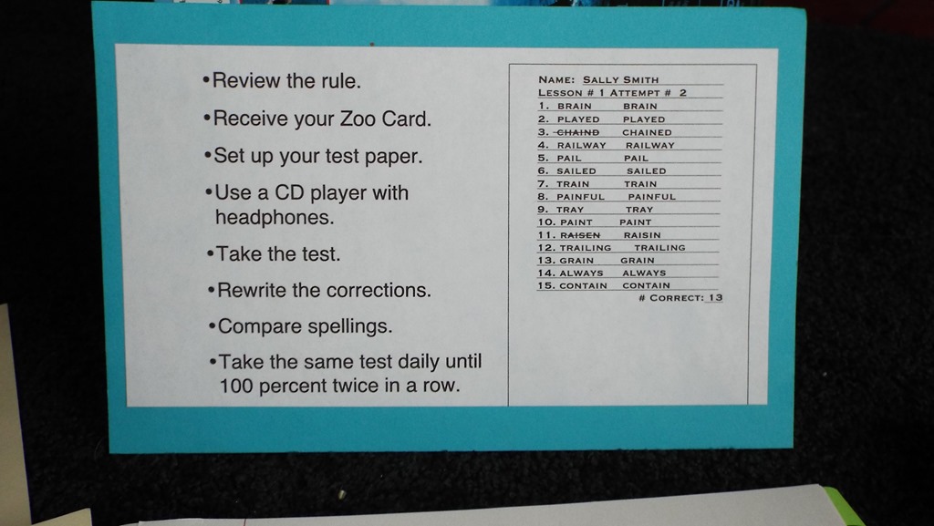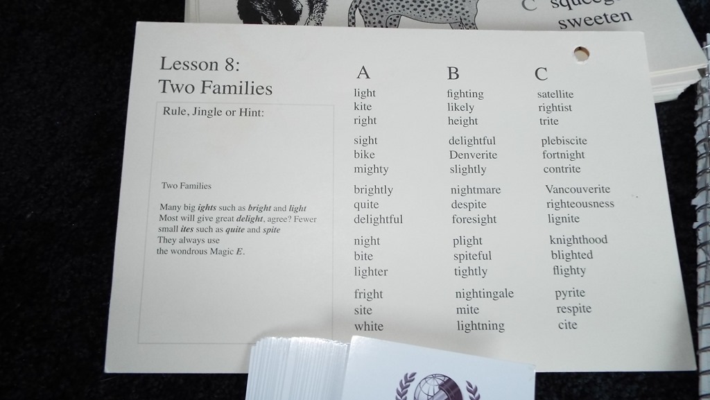 Even though we had done this a couple of years ago, I listened to all of the available MP3’s, watched Spelling and the Brain and read the Teacher’s Notes. The teacher’s notes have quite a few print outs to help. I chose the graphic below to help Jon remember what to do for each lesson.