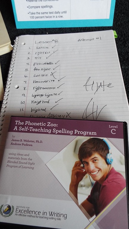 You listen to the words read, listening to a jingle of the spelling rule every 4-5 words, and write it out. Then you listen to the next track that has the words spelled out. The student corrects their own work, writing down the correct spelling. This week, on lesson 8, he was pretty familiar with the words and with the rule. While taking photos for the review, I see that he did not re-write the words with the second track. Then, I remembered, this week he asked me to read the words to him.