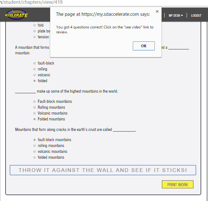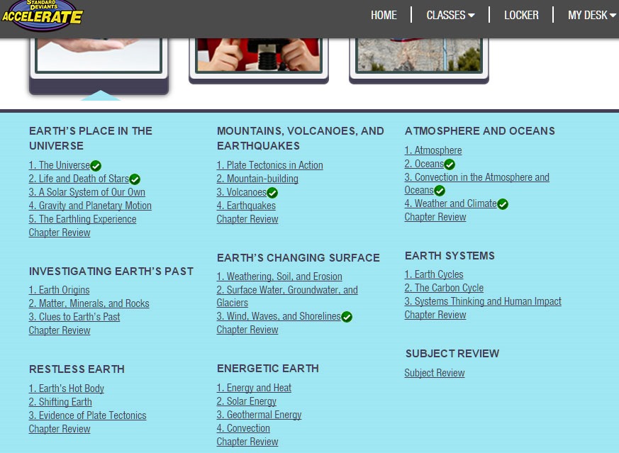 When Jon logs in, he sees the same screen as I did above. He may click on a class, Earth Science shown above, and choose a lesson. I’d assume that it would be better to go 1.2.3.4.5 – but, ya. Jon. I was in the room when he did the lessons. They are stand alone. It didn’t feel like he couldn’t do the work because he started on #2, or jumped into Wind, Waves and Shorelines. He can quickly see which ones he’s worked on.