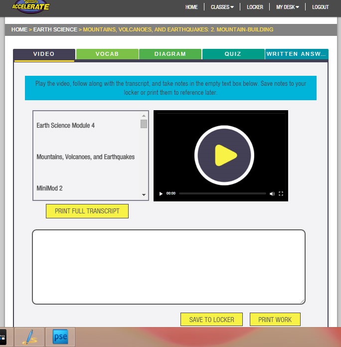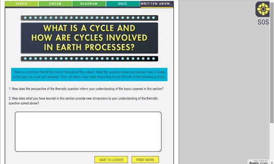 Once he clicks on a topic, there is a five tabbed screen ready. You may click the video, print a full transcript, or scroll through the transcript as the video plays. There is a box for the student to take notes in and ‘save to locker’. More on the Locker in a bit. The film is entertaining and informative. It switches character and bounces from serious academic, to serious humor. There are enough screens with the words/formulas/diagrams to help a visual learner soak in the knowledge. There is direct spoken language to help the auditory learner. There is enough of a pace to keep the distracted learner involved.