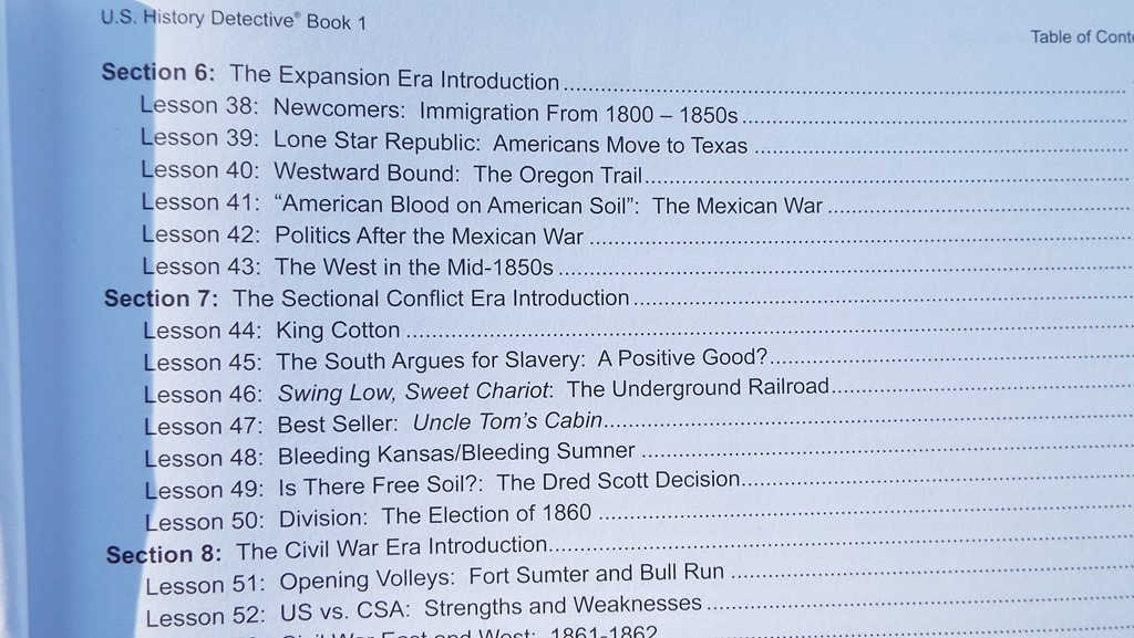 There are fun facts, photos, flags, and maps for the visual learner. There are pages to write out longer sentences, short paragraphs or essays and as responses. We used this in place of this year’s curriculum while reviewing. I think it could be a stand alone curriculum for this time period. We are doing to the present, so you’d need to get another book. We are almost finished with the book, jumping in at section 6. There are 9 sections. Each section has an introduction, and then 7 lessons. We are doing a lesson a day, so it went quickly.