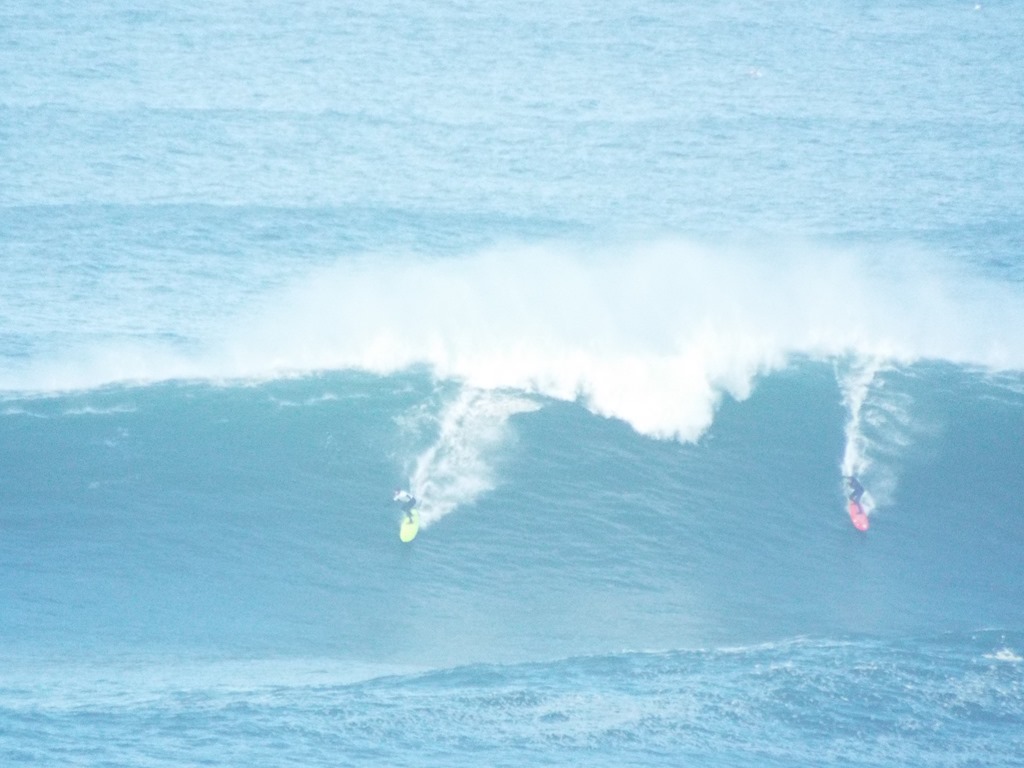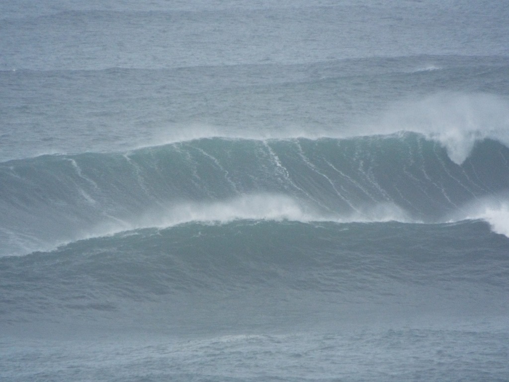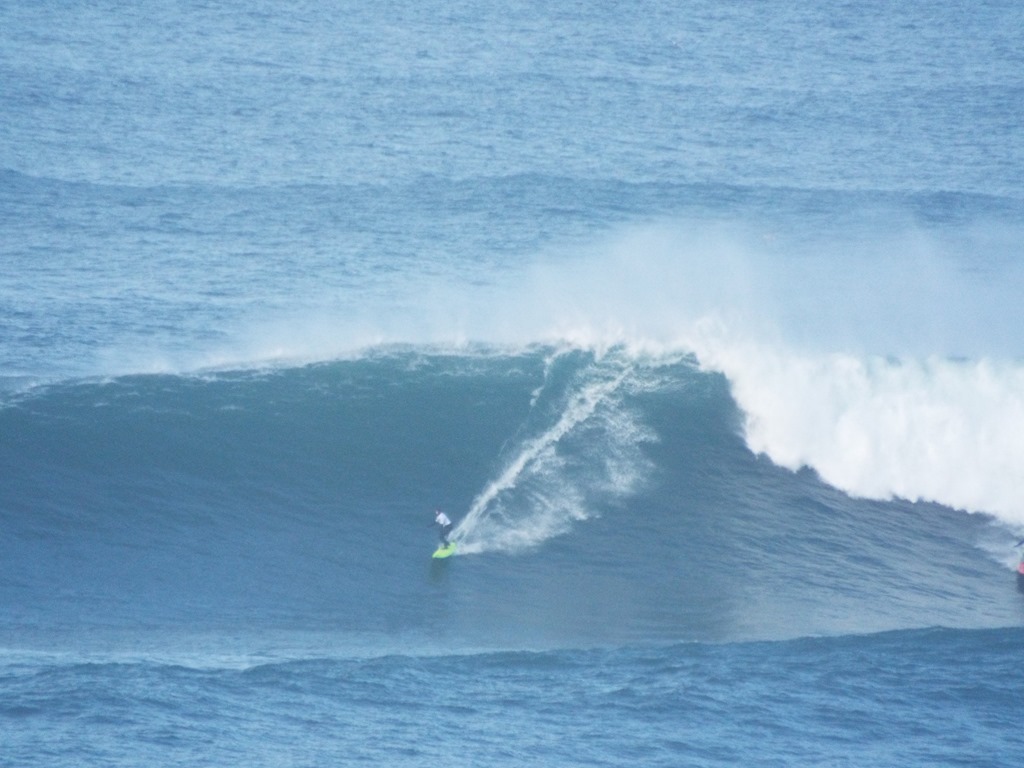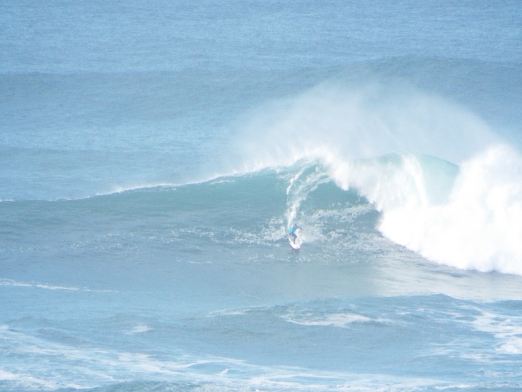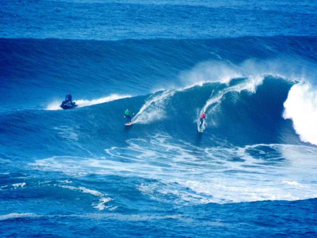 You’re out in the ocean, a half mile or more off shore. The only sane way to get out there is by Jet Ski or a boat. Sets of swells come in on powerful storm surges and can create a wave over 60 feet high. This week it has been between 20-30+.