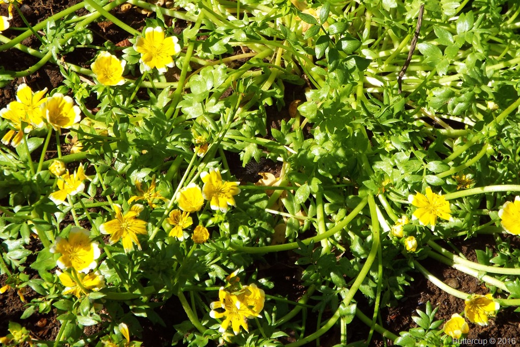 For instance – we have had rain almost every single day since November 15th, 2015. Yes, this month we’ve had a string of days with blue sky, but like this morning, all is damp and the sky is still grey. This has created growth like I’ve either never seen, or never recalled seeing. Take the buttercups below. I thought they were a new species, but they are just the most full thick plants I’ve ever noticed.