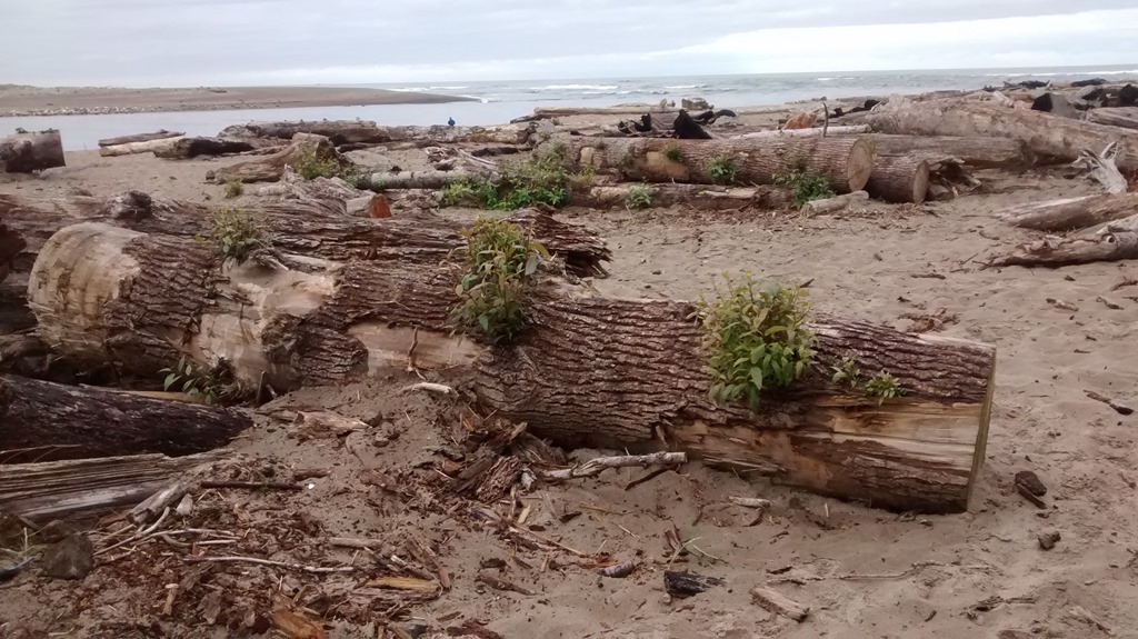 As I started to walk up the beach – a place that has been stripped clean from ocean high tides and has a vast amount of logs deposited from winter storms – I noticed that there was a lot of shrubbery. I’m only half a cup of coffee into my day and I start to ponder why and how the shrubs would grow in the sand. Did the river bring up a lot of dirt? huh. I won’t mention how long I pondered, but I must have hit the bottom of my coffee cup when I noticed that the growth was on the logs.