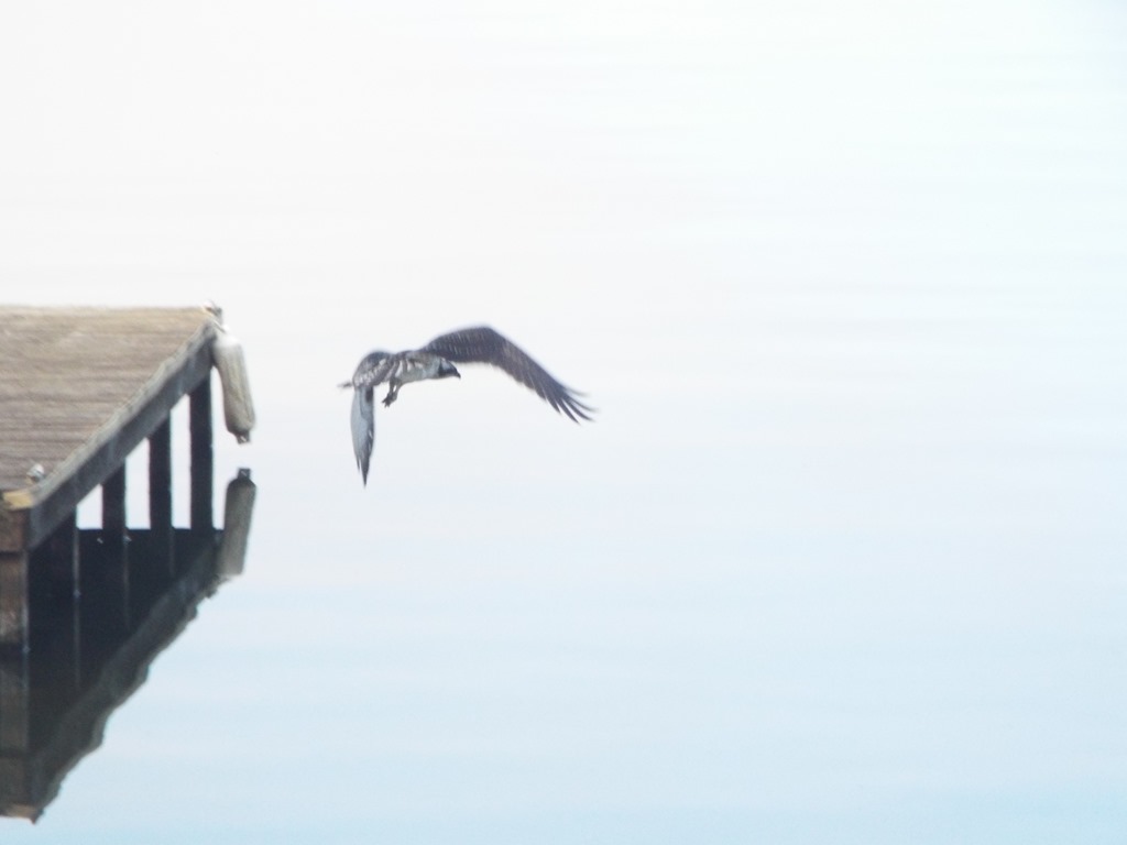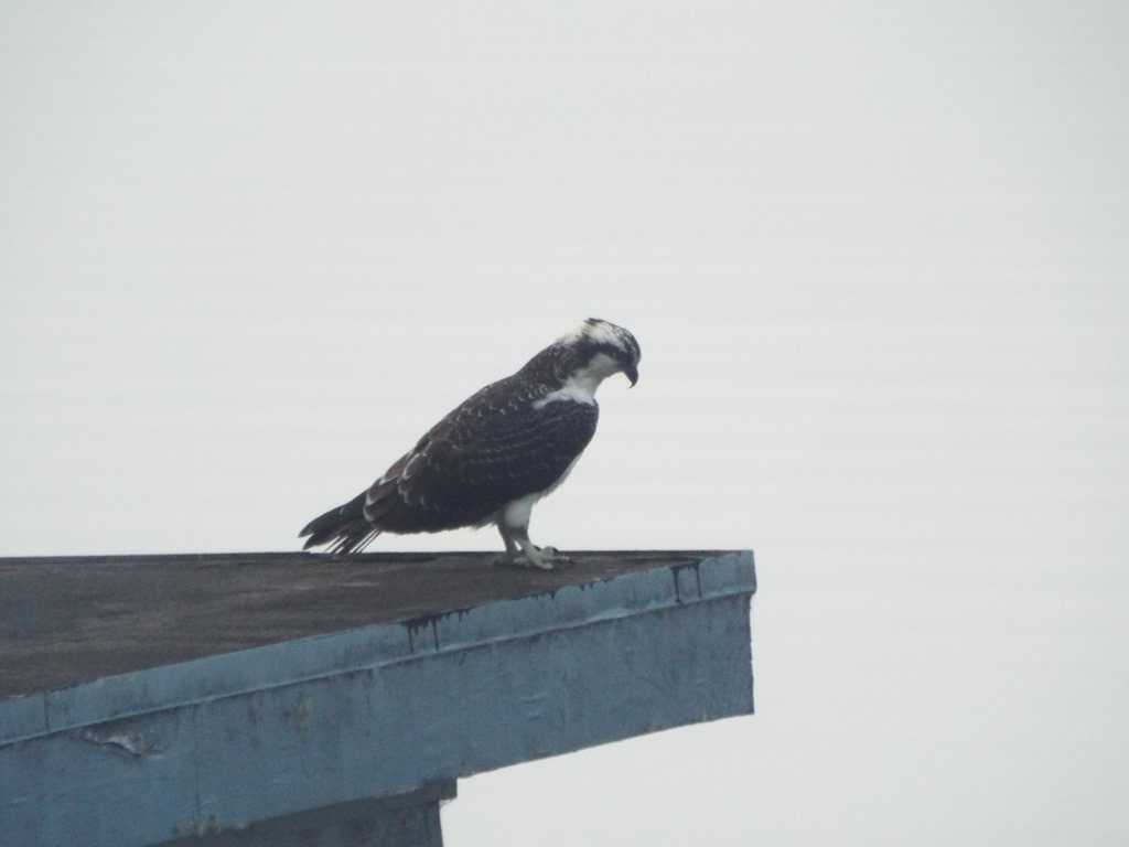 My younger son came in to grab the camera, his face and voice showing excitement due to an Osprey on the Boathouse! We have had quite a few Osprey and Eagles this late summer. I hope we get to watch them all winter. Most months they move a couple of miles south to the other side of the lake. This guy spent the whole day just observing – not really eating. He might be a new baby. I hope he likes the neighborhood.