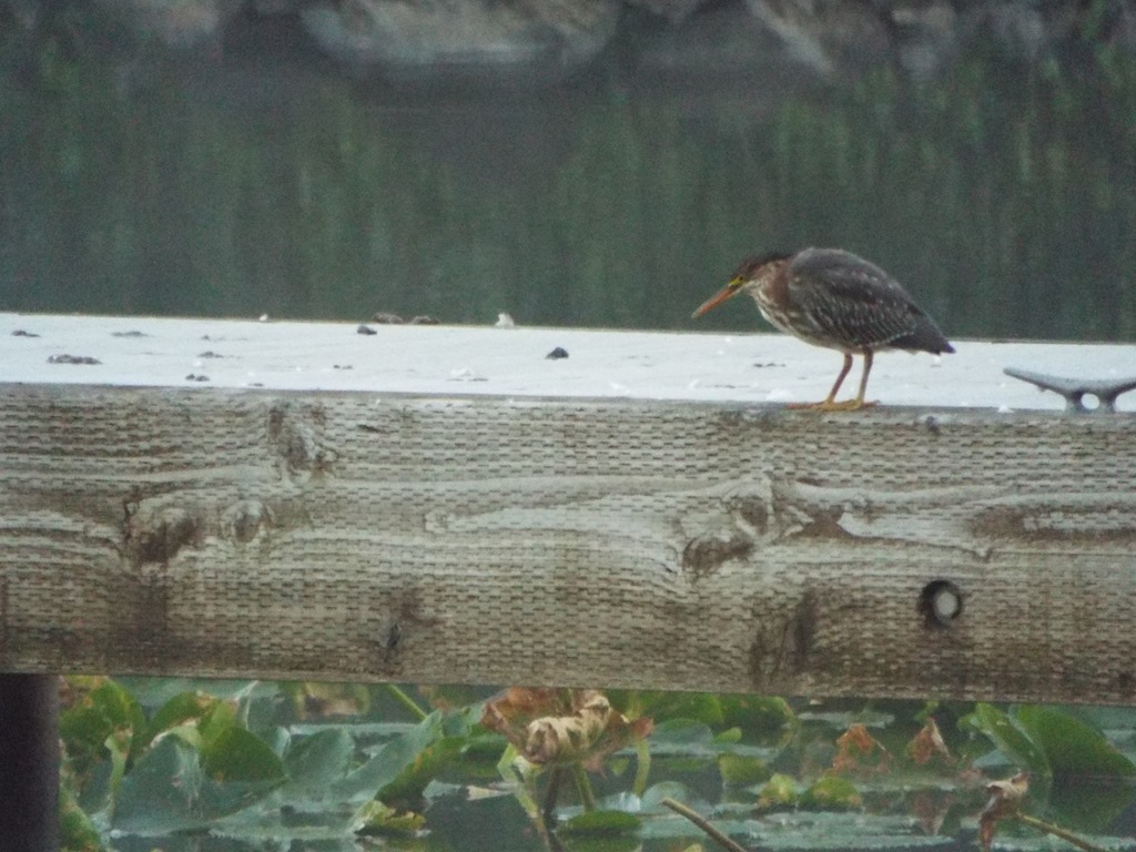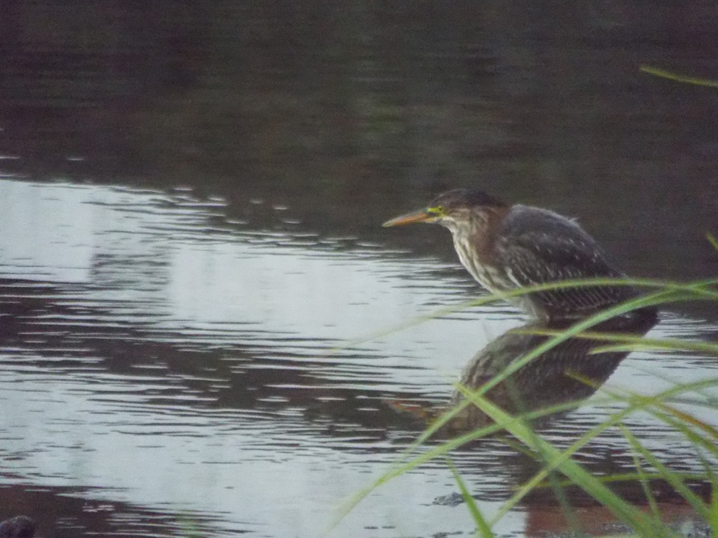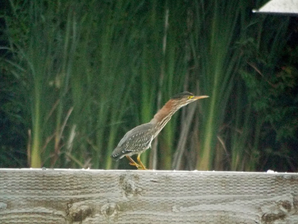 A Green Heron! He looks like a small football, about that size, all tucked in. He is rare to see as he likes to pretend he is a sand piper and keep seriously close to the shoreline, away from our eyes.