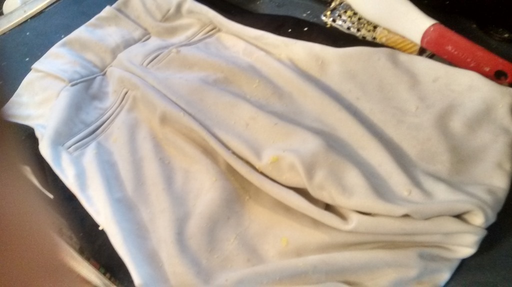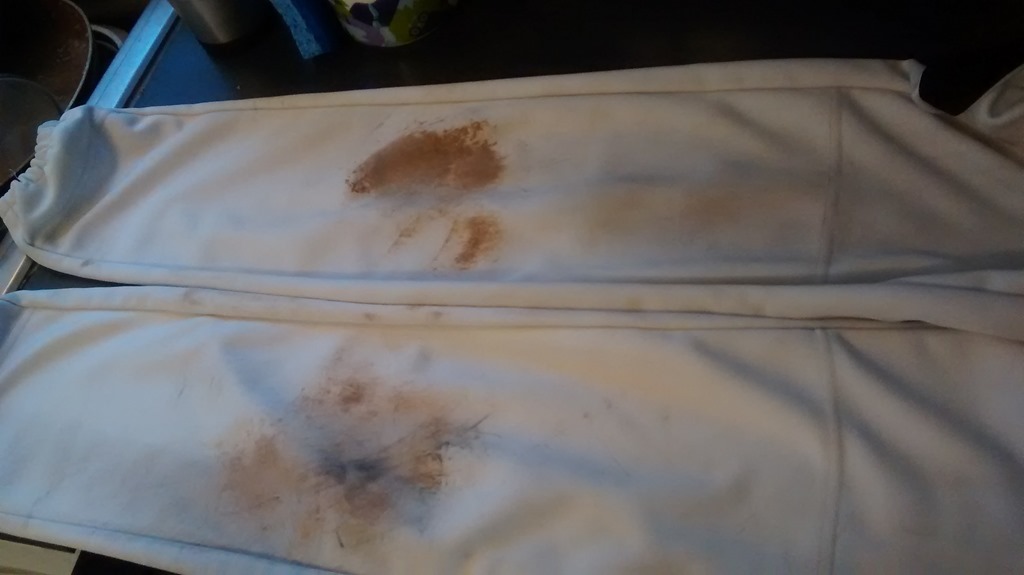 Here are the pre-wash results – this is the rear, I didn’t take pre- bottom results, but they were bad. We also have no idea how old these pants are, as they are uniforms from the JV Baseball team. I can’t just go buy 6 more pairs.