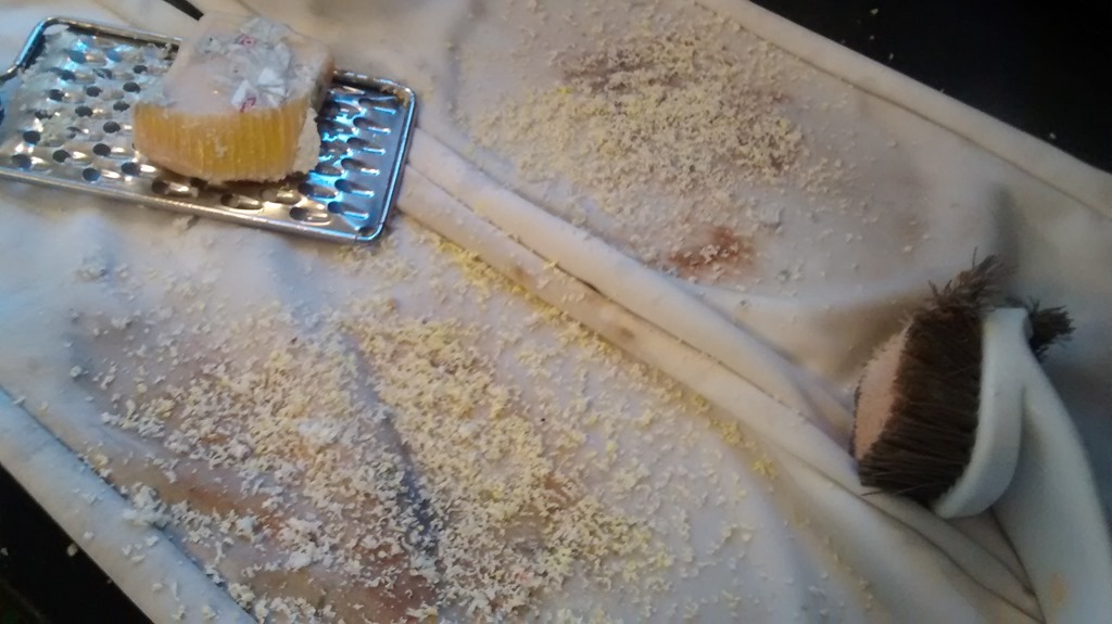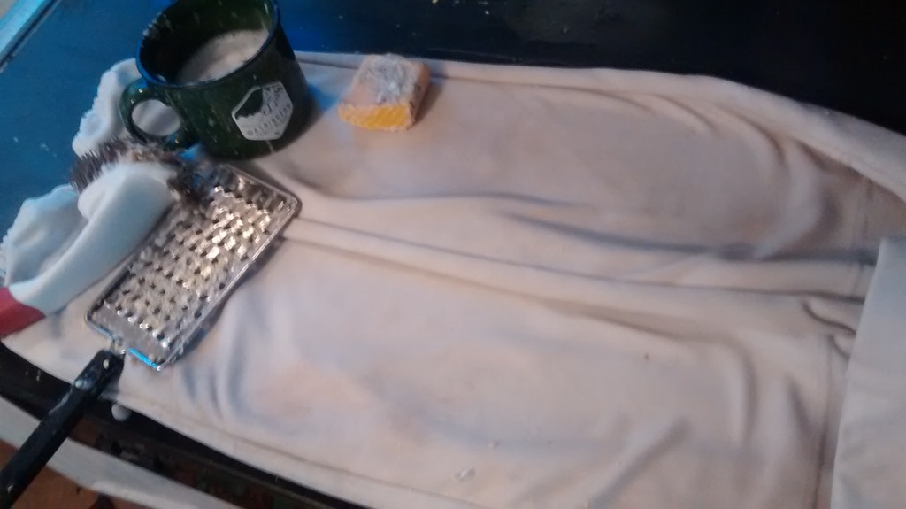 This year, I had a new thought – first, using a scrub brush to get at the stains instead of my wrist. Second, shred some soap onto the brush. That led to shredding the soap directly onto the pants. BINGO!!!! Hot water + Shredded Fels-Naptha + A little bit of scrubbing with a stiff brush = Sparkly White Baseball Pants! WOO HOO!