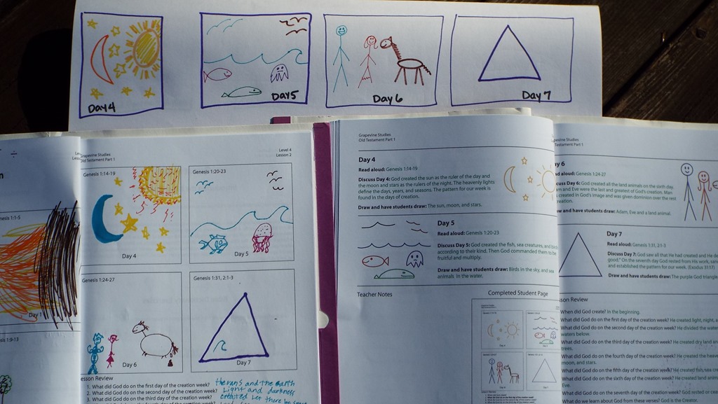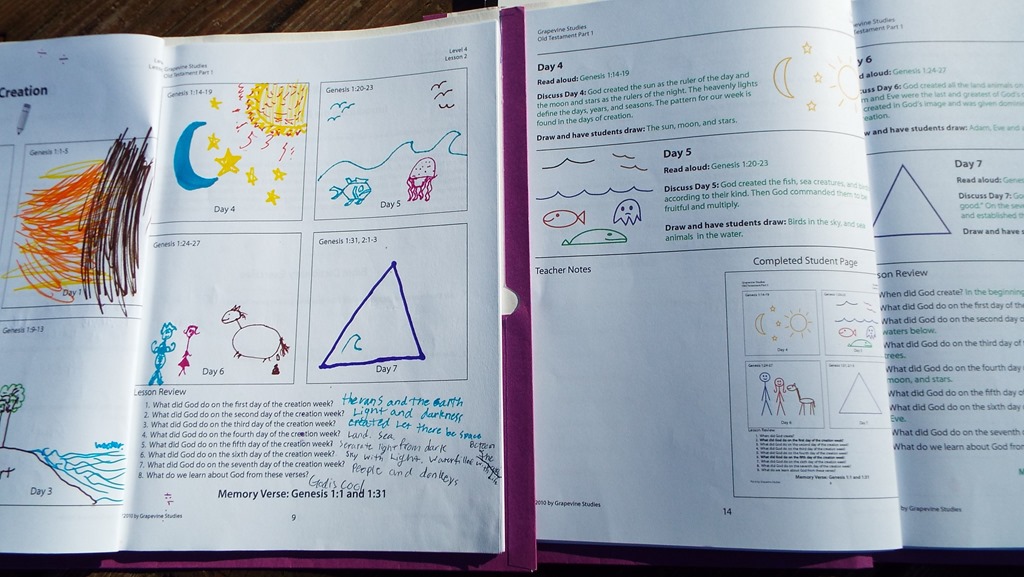 Recommending it? I would say yes. I have many friends who as for a Bible Study curriculum, and I usually answer back – Well, have you tried reading the Bible? Snarky. I know. But I think this will help. I do feel like this was for a younger crowd, but the Word does not go out void, so we did get a lot out of our mornings. The drawing is easy and fun, my son took quite a few liberties at vamping up his squares, and the teacher’s text says to allow them to be creative in their drawings. A couple of days we even had the Teacher’s book out, and took turns being the teacher. So if you do not have anything right now that brings you to the Word as a family – I do recommend GrapeVine Studies.